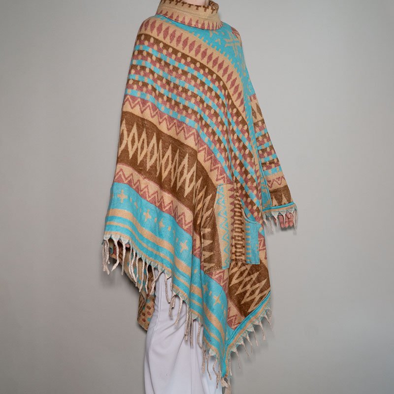 Dizainas: unikalus, įvairiaspalvis raštas – kiekvienas pončas turi savitą spalvų derinį, todėl kiekvienas gaminys yra vienintelis ir nepakartojamas.