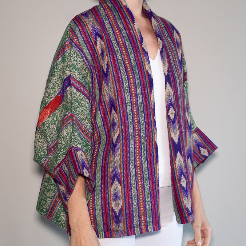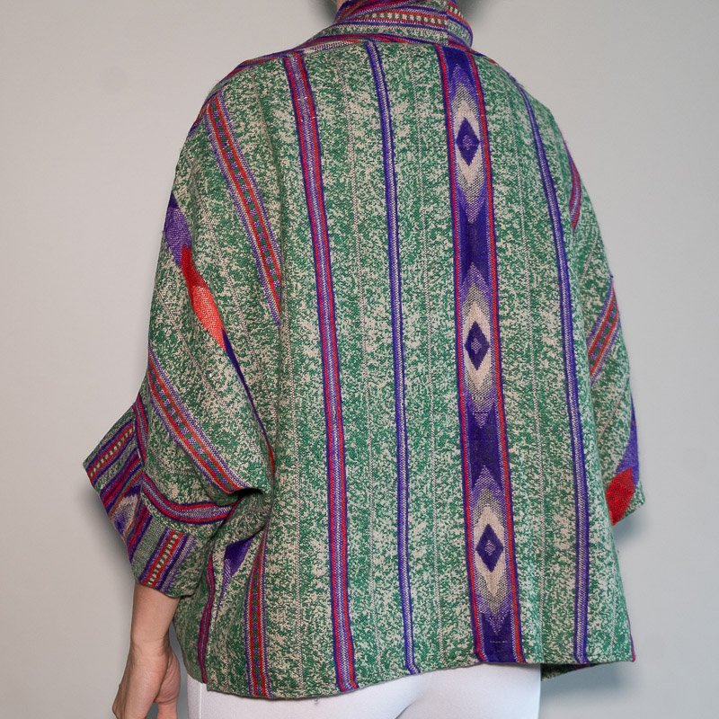 Dizainas: laisvo kimono kirpimo siluetas su plačiomis rankovėmis ir atviru priekiniu kraštu. Įvairiaspalvis, rankų darbo įkvėptas raštas kiekvienam švarkeliui suteikia individualumo – nėra dviejų vienodų gaminių.