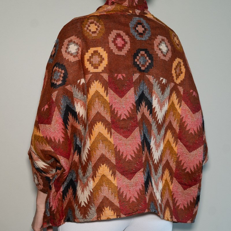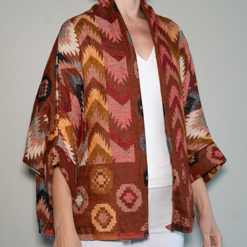 Dizainas: laisvo kimono kirpimo siluetas su plačiomis rankovėmis ir atviru priekiniu kraštu. Įvairiaspalvis, rankų darbo įkvėptas raštas kiekvienam švarkeliui suteikia individualumo – nėra dviejų vienodų gaminių.